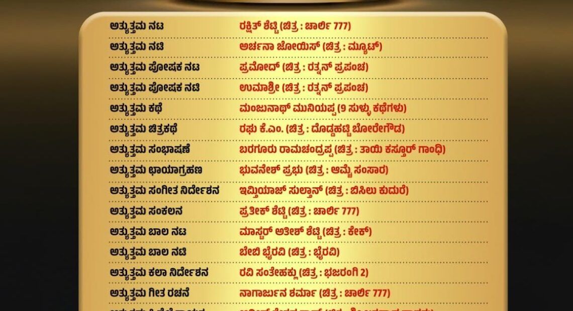 ‘ಮ್ಯೂಟ್’ ಚಲನಚಿತ್ರದ ಅಭಿನಯಕ್ಕಾಗಿ ನಟಿ ಅರ್ಚನಾ ಜೋಯಿಸ್ ಅವರು ‘ಅತ್ಯುತ್ತಮ ನಟಿ ಪ್ರಶಸ್ತಿ’ಗೆ ಭಾಜನರಾಗಿದ್ದಾರೆ. ಕೆ. ಎಂ. ರಘು ನಿರ್ದೇಶನದ ‘ದೊಡ್ಡಹಟ್ಟಿ ಬೋರೆಗೌಡ’ ಚಿತ್ರಕ್ಕೆ ‘ಮೊದಲನೇ ಅತ್ಯುತ್ತಮ ಚಲನಚಿತ್ರ ಪ್ರಶಸ್ತಿ’ ನೀಡಲಾಗಿದೆ. ‘777 ಚಾರ್ಲಿ’ ಚಲನಚಿತ್ರ ‘2ನೇ ಅತ್ಯುತ್ತಮ ಚಿತ್ರ ಪ್ರಶಸ್ತಿ’ ಪಡೆದುಕೊಂಡಿದೆ. ‘ಬಿಸಿಲು ಕುದುರೆ’ ಚಲನಚಿತ್ರ ‘3ನೇ ಅತ್ಯುತ್ತಮ ಚಿತ್ರ ಪ್ರಶಸ್ತಿ’ ತನ್ನದಾಗಿಸಿಕೊಂಡಿದೆ.