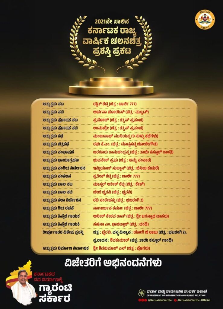 2021ನೇ ಸಾಲಿನ ‘ಕರ್ನಾಟಕ ರಾಜ್ಯ ಚಲನಚಿತ್ರ ಪ್ರಶಸ್ತಿ’ ಪ್ರಕಟ