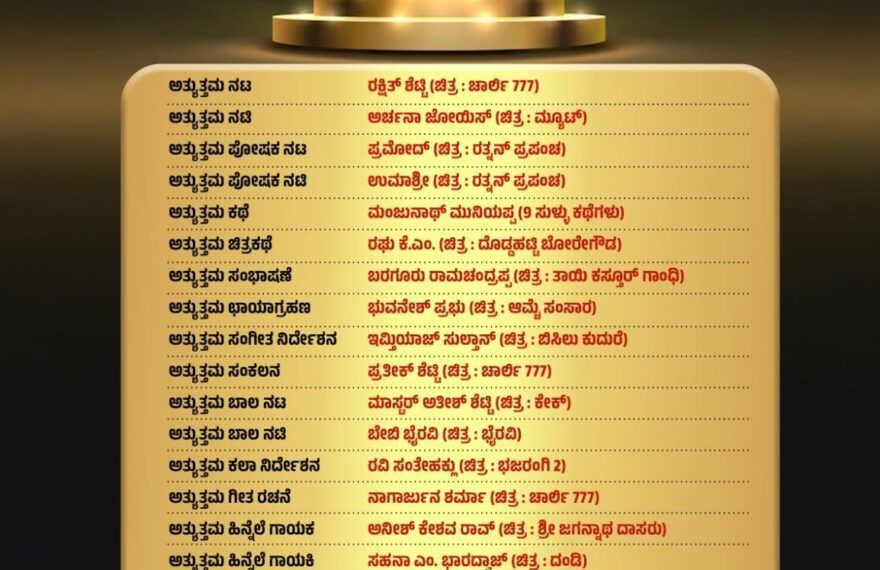2021ನೇ ಸಾಲಿನ ‘ಕರ್ನಾಟಕ ರಾಜ್ಯ ಚಲನಚಿತ್ರ ಪ್ರಶಸ್ತಿ’ ಘೋಷಣೆ ‘ಮೊದಲ ಅತ್ಯುತ್ತಮ ಚಿತ್ರ’ ಪ್ರಶಸ್ತಿ ಪಡೆದುಕೊಂಡ ‘ದೊಡ್ಡಹಟ್ಟಿ ಬೋರೇಗೌಡ’ ರಕ್ಷಿತ್ ಶೆಟ್ಟಿ, ಅರ್ಚನಾ ಜೋಯಿಸ್ ಮುಡಿಗೆ ಅತ್ಯುತ್ತಮ ನಟ-ನಟಿ ಪ್ರಶಸ್ತಿಯ ಗರಿ 2021ನೇ ಸಾಲಿನ ಕನ್ನಡ ಚಲನಚಿತ್ರಗಳಿಗೆ ಕರ್ನಾಟಕ ರಾಜ್ಯ ಸರ್ಕಾರದ ವತಿಯಿಂದ Continue Reading